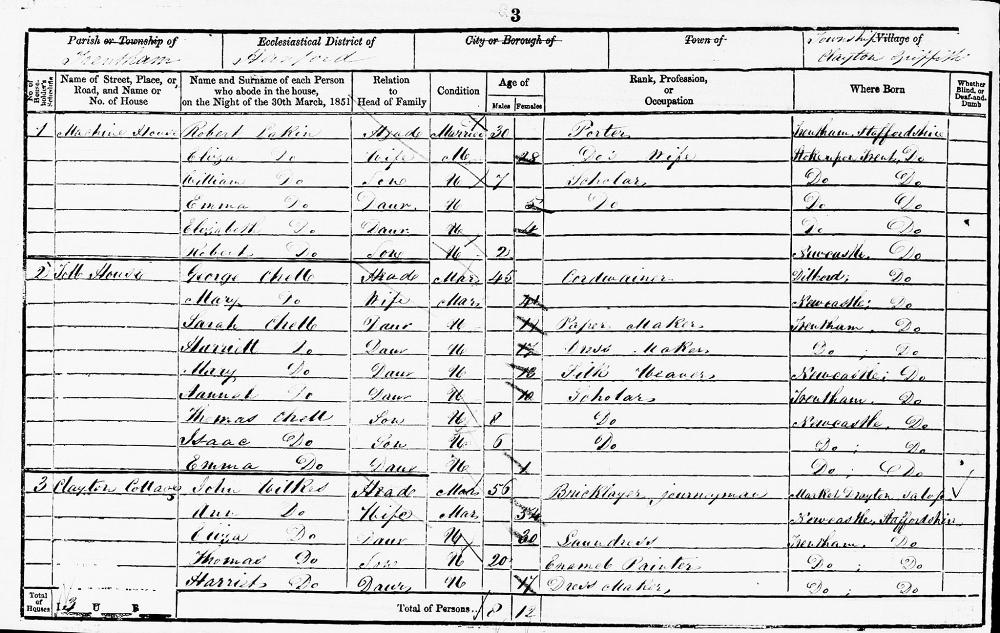 England Census 30 March 1851 : 1, Machine House Clayton Griffiths, Trentham Staffordshire District Stone Parish Trentham Piece 2000 Folio 652 Page Number 3 3