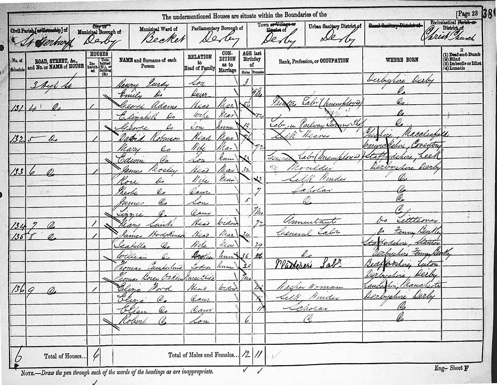 England Census 3 April 1881 : 4, High Street Derby Derbyshire District Derby Parish St Werburgh Class RG11 Piece 3400 Folio 38 Page Number 23 GSU Roll 1341813 23