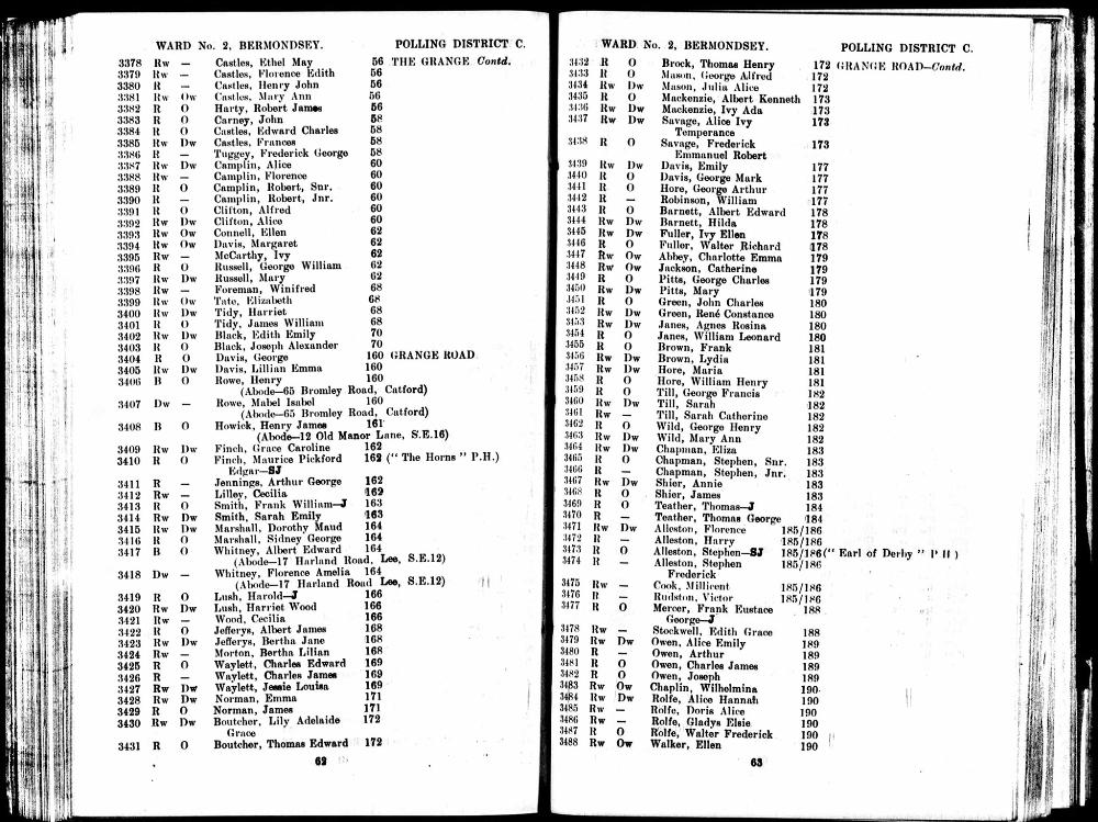 Residence Details: 182, Grange Road, Bermondsey July 1933 : Source Bermondsey Polling District C ; Page 63 Entries 3460-1