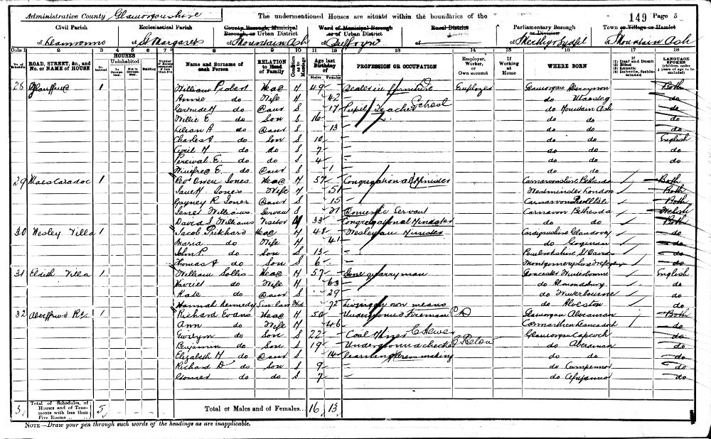 Wales Census 13 March 1901 : Glanffrwd, Mountain Ash Llanwonno Glamorgan, Wales District Pontypridd : Sub District Llanwonno Parish St Margaret Emuneration District 45 Piece 5006 Folio 149 Schedule 28 Page Number 5 5