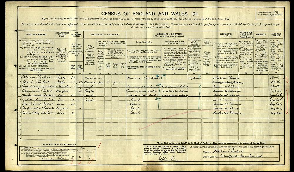 Wales Census 2 April 1911 : Glanffrwd, Mountain Ash Llanwonno Glamorgan District Pontypridd (589) : Sub District Llanwonno Emuneration District 38 Class RG14 Piece 32284 Schedule 24