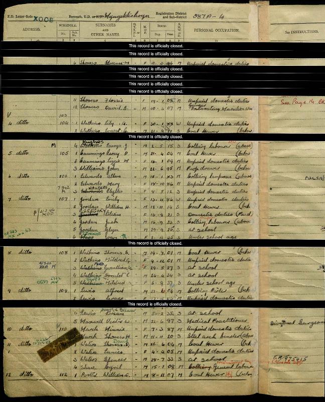 England and Wales Register 29 September 1939 : 11, LLwynow Road Mynyddislwyn Monmouthshire District 587A : Sub District 4 Parish Mynyddislwyn Emuneration District XOOB Class RG 101/7453A Schedule 111/1 Line 40