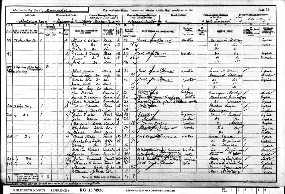 Wales Census 13 March 1901 : 7, Glyn Crug Cottages, Mount Pleasant Row Abertillery Monmouthshire District Bedwellty : Sub District Aberystruth Emuneration District 22 Class RG13 Piece 4936 Folio 58 Schedule 205 Page Number 36 36