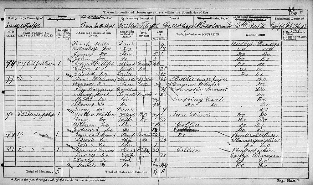 Wales Census 2 April 1871 : 84 Twynyrodyn Merthyr Tydfil Glamorgan, Wales District Merthyr Tydfil Class RG10 Piece 5393 Folio 48 Page Number 17 GSU Roll 849482 17