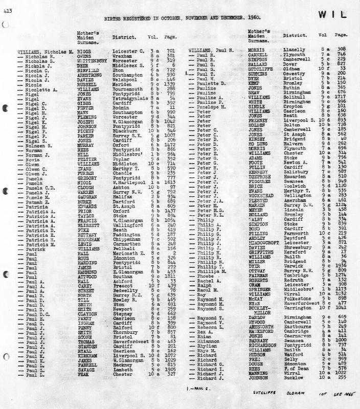 Birth Register Paul D WILLIAMSRegistered at Rowley Regis on December 1960 Volume 9b Page 969 Mothers Maiden Name TILL