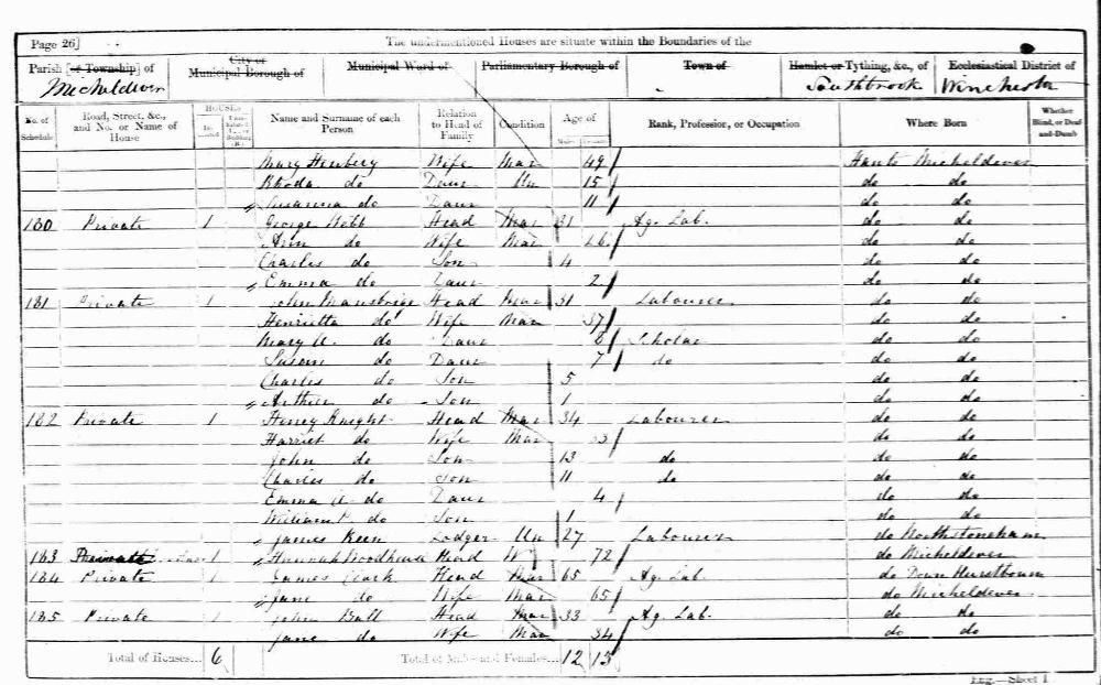 England Census 7 April 1861 : 181, Private, Southbrook Micheldever Hampshire Class RG9 Piece 689 Folio 42 Page Number 26 GSU Roll 542685 26