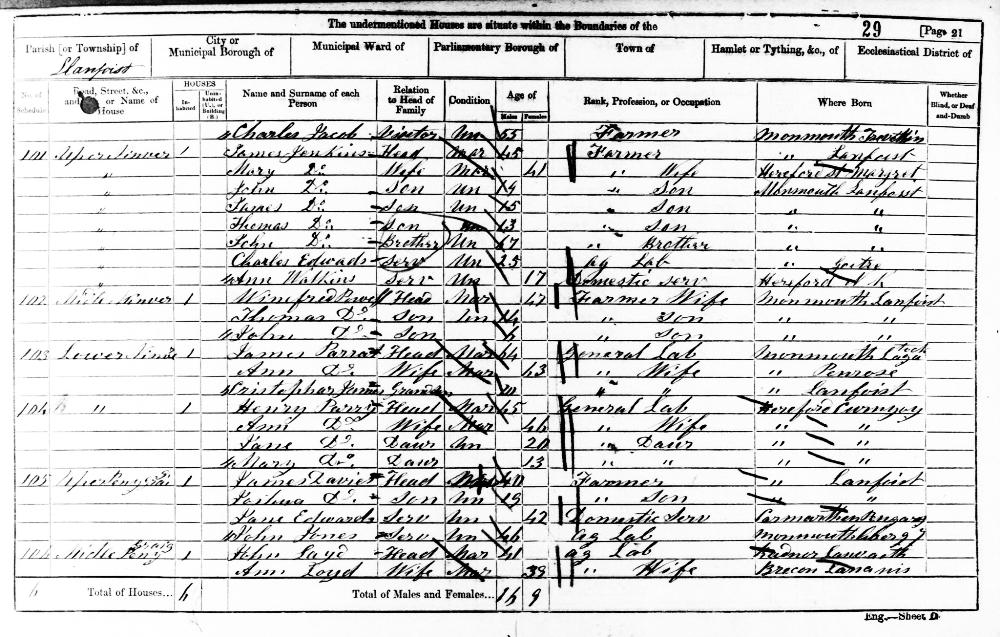 Wales Census 7 April 1861 : Midle Pen Y Graig Llanfoist Monmouthshire District Abergavenny : Sub District Blaenavon Emuneration District 2 Piece 3995 Folio 29 Schedule 106 Page Number 21 21