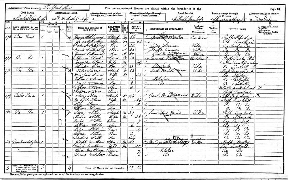 England Census 13 March 1901 : 180, Dales Lane Daw End, Rushall Staffordshire District Walsall : Sub District Aldridge Parish St Michael Emuneration District 11 Piece 2705 Folio 125 Schedule 180 Page Number 34 34