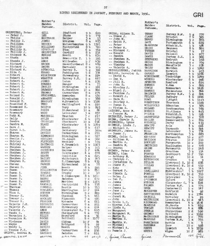 Birth Register Ronald GRIGGRegistered at Walsall on March 1956 Volume 9b Page 977 Mothers Maiden Name DAVIS