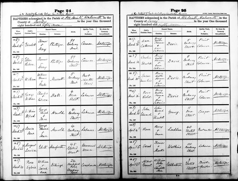 Baptised: Ann Catherine DAVIS Born 25 March 1877 of 8, Beckway Street Was Baptised on 30 March 1887 at All Saints, Walworth, Surrey Father Henry Walter Norman DAVIS a Print Colourer Mother Ann Catherine DAVIS (CROSSMAN) Source: London, England, Church of England Births and Baptisms, 1813-1917 Page 25 Entry no. 193