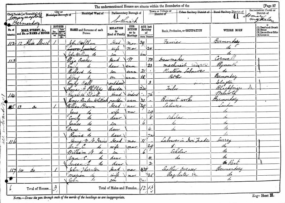 England Census 3 April 1881 : 13, Alice Street Bermondsey London District Bermondsey : Sub District Southwark Parish St Mary Magdelen Piece 560 Folio 41 Page Number 27 27