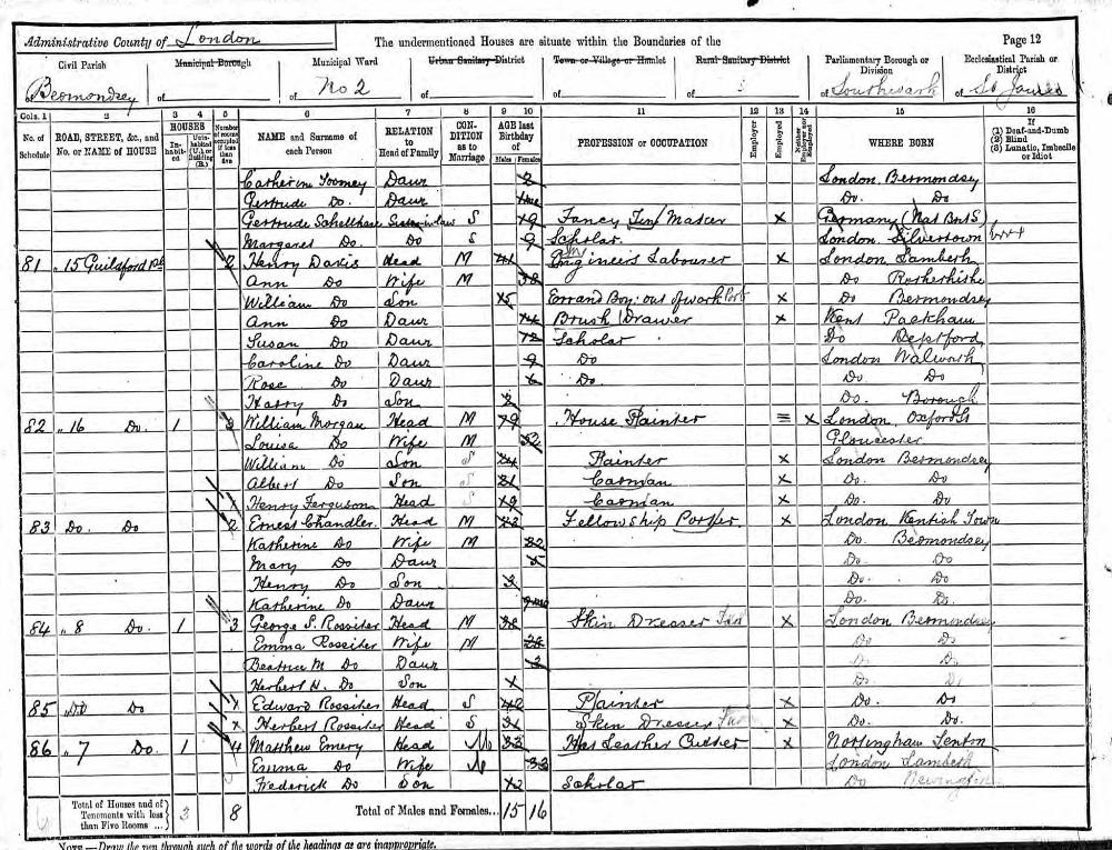 England Census 5 April 1891 : 15, Guildford Place Bermondsey London District St Olave, Southwark : Sub District St James, Bermondsey Parish St James Emuneration District 34 Piece 380 Folio 64