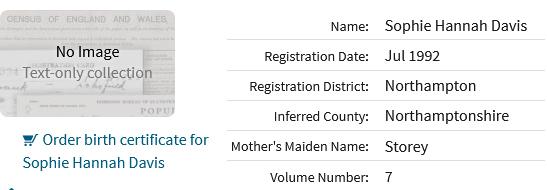 Birth Register Sophie Hannah DAVISRegistered at Northampton on July 1992 Volume 7 Page 2870 Mothers Maiden Name STOREY