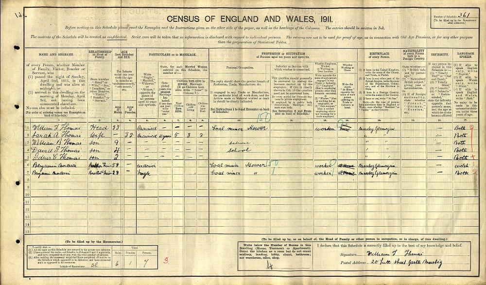 Wales Census 2 April 1911 : 20 Pit Street Garth, Maesteg Glamorganshire District Bridgend (591) : Sub District Maesteg (1) Parish Cwmdu Emuneration District 9 Piece 32534 Schedule 361