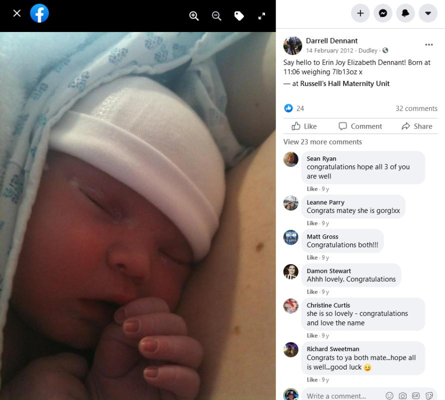 Birth Facebook entry by Darrell DENNANT Erin Joy Elizabeth DENNANT Registered at Dudley on 14 February 2012